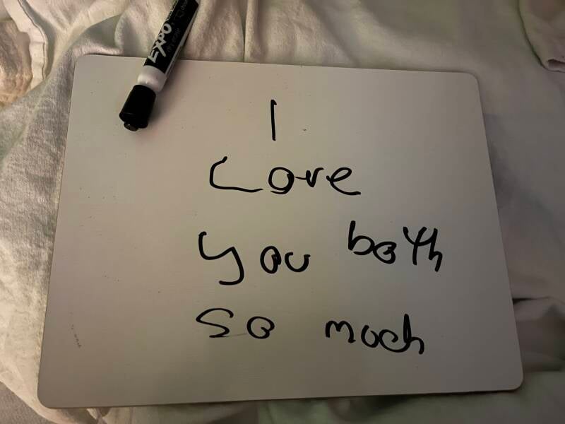 She is now in a private room awaiting pain meds and some well-deserved rest. Her silent retreat has begun and she greeted CL and me with the following dry erase board missive while we filled her in on the day's procedures. (We feel the same about her 100% btw). Goodnight, everyone! Enter your night's slumber with gratitude for those who earn a living caring for others. The surgeons, nurses, aids, volunteers, janitors...you name it...earned our thanks and love today. XO--A.